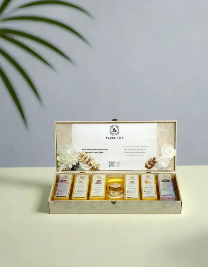 This elegant box brings together a complete range of Ayusutra’s signature products—each designed to care for mothers and babies using time-tested Ayurvedic wisdom.